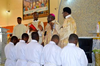 The Nigeria Delegation of the Congregation of the Oblates of the Virgin Mary had a moment of joyous celebration at St. Anthony's Parish, Asipa, Ibadan, on Sunday the 24th of April, 2016, as 5 of her Finally Professed members were raised to the Order of Deacons by the Archbishop of Ibadan, Most Rev. Dr. Gabriel 'Leke Abegunrin.