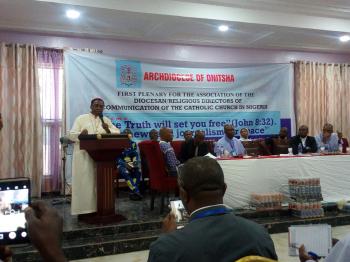 The Auxiliary bishop of Onitsha Archdiocese and the Episcopal Chairman of Communications in Nigeria, Most Rev. Dr Denis Chidi Isizoh at the First Plenary meeting of the Directors of Communications at Onitsha with the theme: "The Truth will Set you Free: Fake news and Journalism for Peace", said, "fake news is very difficult to control because of the new media, news people now have access to various information." He made this remark at the just concluded plenary meeting of the Directors of Communications. He stated clearly that one could only talk about truth and journalism of peace only when he/she is in control of the news. How do we control the news coming to us? He asked. He was of the opinion that, if we, as communicators, keep quiet for the news that have happened before reporting, then people will help us to fill the vacuum. So, it is very important to fill the vacuum by reporting the news as soon as possible as it happened. As the events are unfolding the Communicator ought to communicate it as fast as possible. Bishop Isizoh reminded all communicators that their job is simply to form and inform. In other words, the job of the communicator is to form conscience and let people know about what is happening in the Church and the Society.